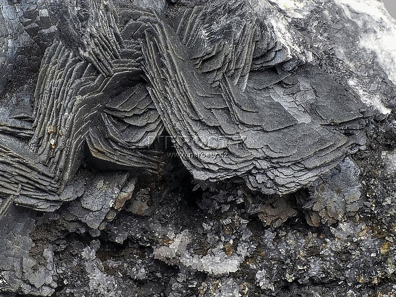 Drúza lupenitých zprohýbaných krystalů kalcitu s vrostlým boulangeritem.Oboustranný vzorek šedočerných agregátů zprohýbaných krystalů kalcitu do 4 cm spolu s jemně vtroušeným šedým boulangeritem na karbonátové podložce. Velmi estetická téměř nepoškozená drúza vyhledávaného černého kalcitu z klasické rumunské lokality. |