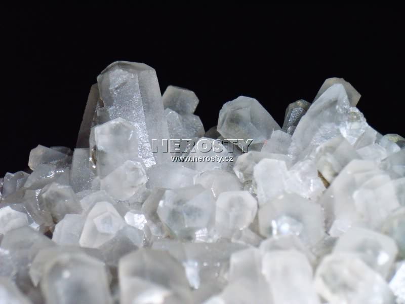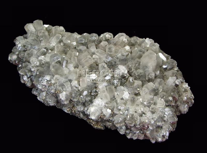 Drůza krystalů krátce sloupcovitých krystalů kalcitu. Vzorek je lehce poškozen. |