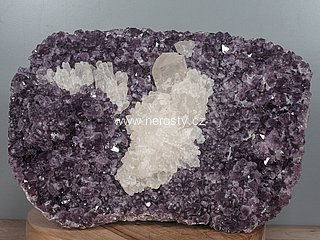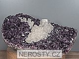 Ametystová drúza, část geody. Na ametyst narůstá skupina kalcitových krystalů. Největší krystal kalcitu měří 5cm. |