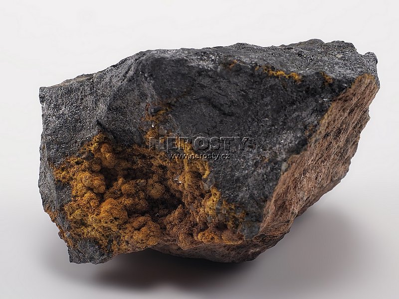 Oranžové jehličky karibibitu, vzácného arzenového minerálu, narostlé na löllingitu.Mělká dutina v kusovém löllingitu má rozměry přibližně 20 x 11 mm je zcela vyplněna chomáčky krátkých jehlicovitých krystalů karibibitu. Drobný ale relativně bohatý vzorek. |