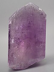 Velký, pěkně rostlý a dobře vybarvený krystal kunzitu.Plochý a oboustranně zakončený monokrystal drahokamově průsvitného kunzitu s příjemnou růžovofialovou barvou. Povrch krystalu je lesklý, hladký a podélně rýhováný. Horní část krystalu je zakončena velkou plochou špicí, dolní zakončení je vícečetné. Barva krystalu je proměnlivá a závisí na způsobu osvětlení a natočení krystalu. |