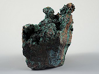 Pěkný vzorek brochantitu v asociaci s dalšími minerály.Výrazně členitý volně stojící vzorek tmavě zeleného brochantitu narostlého v dutinách limonitu. Brochantit je v nich místy prorostlý drobounkým malachitem, cerusitem a sádrovcem.