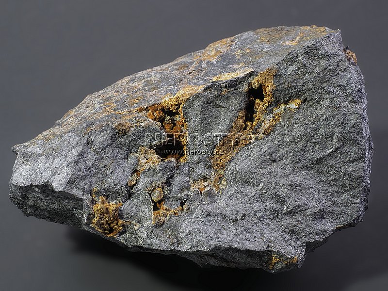 Oranžové jehličky karibibitu, vzácného arzenového minerálu, narostlé na löllingitu.Drobné dutiny v kusovém löllingitu jsou vyplněny chomáčky krátkých jehlicovitých krystalů hnědooranžového karibibitu.