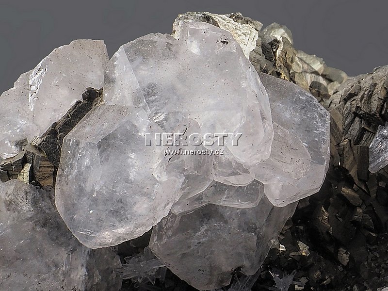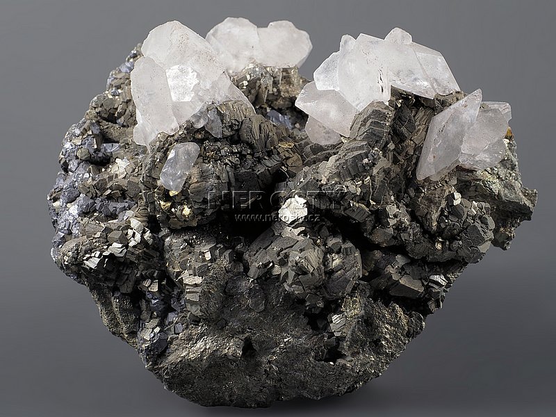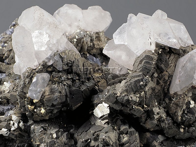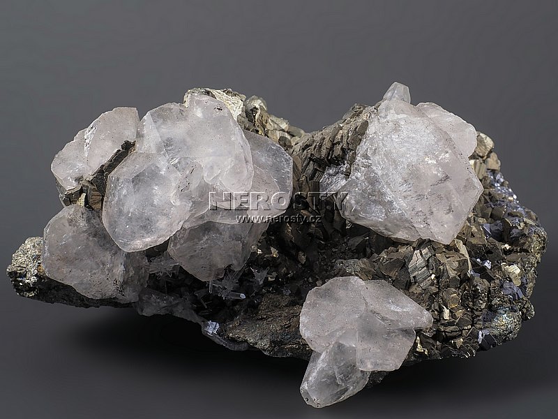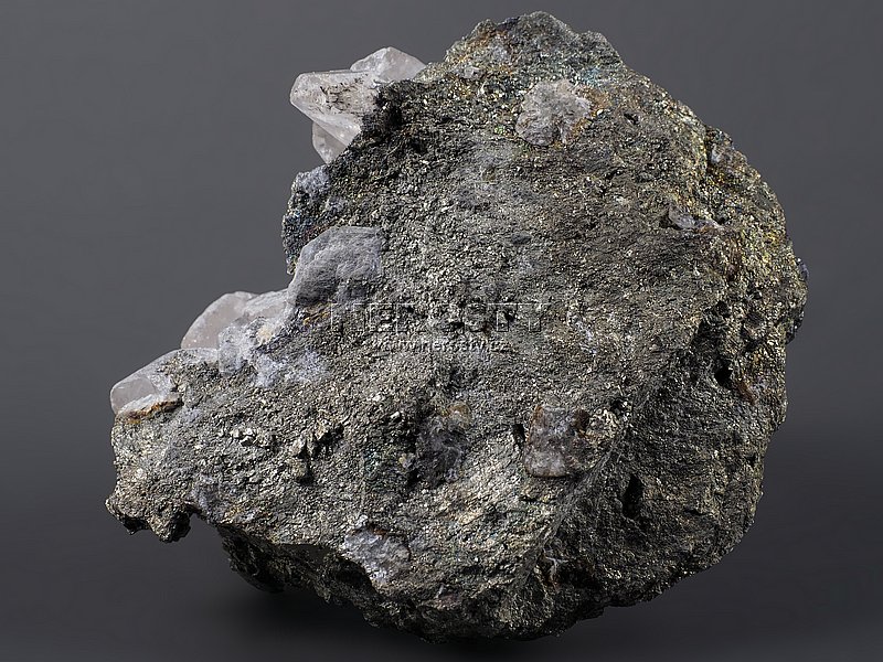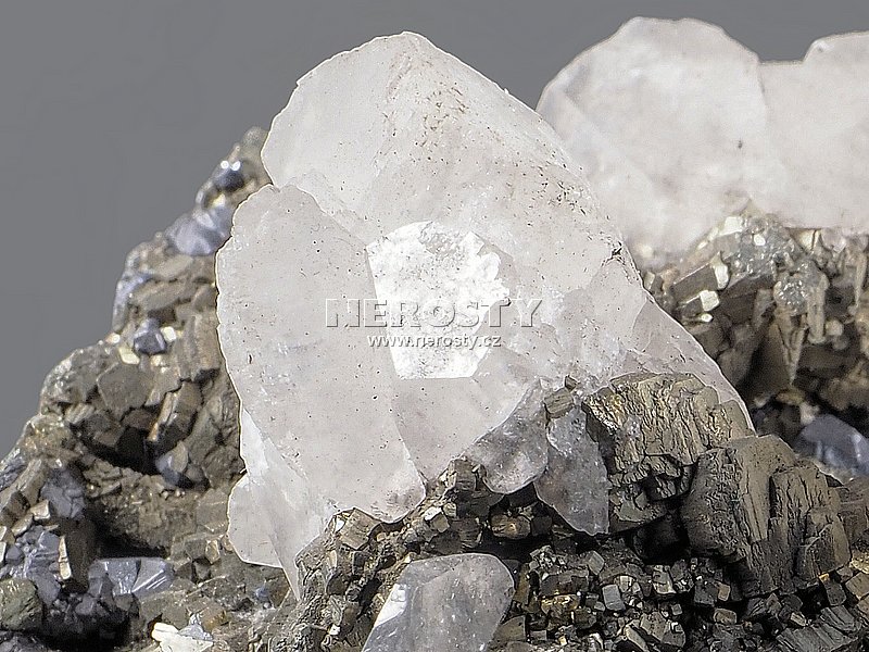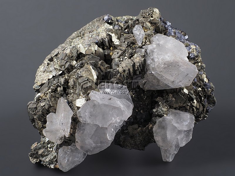 Estetická pyritová drúza ozdobená bílým kalcitem.Lesklé pyritové krystaly o velikosti do jednoho centimetru jsou hojně porostlé pěkně vyhraněným kalcitem. Volně stojící vzorek.