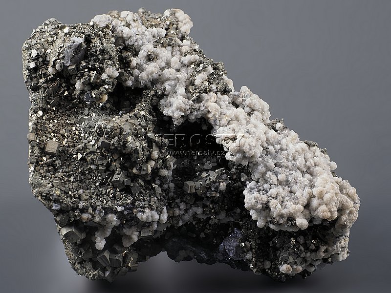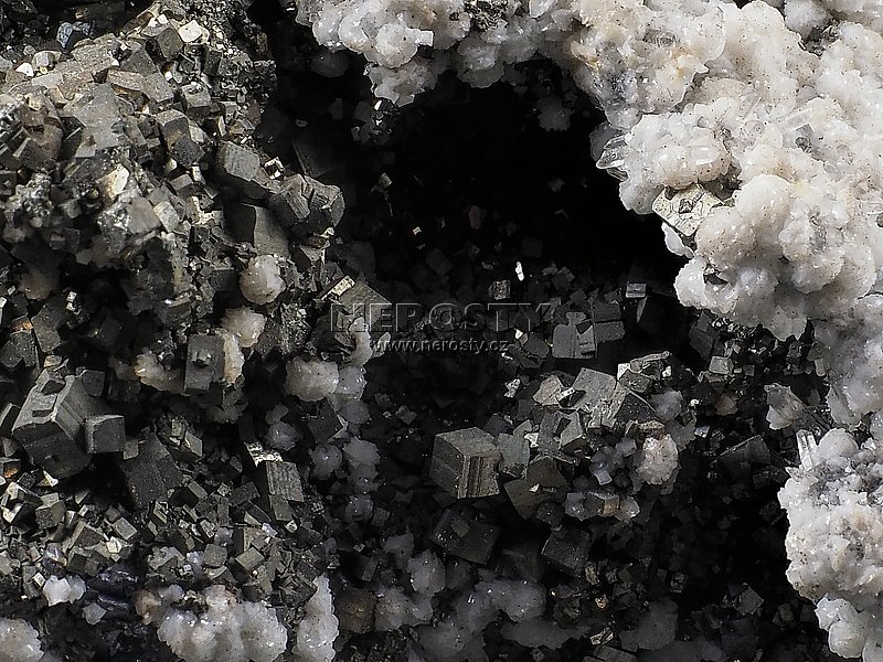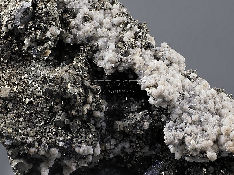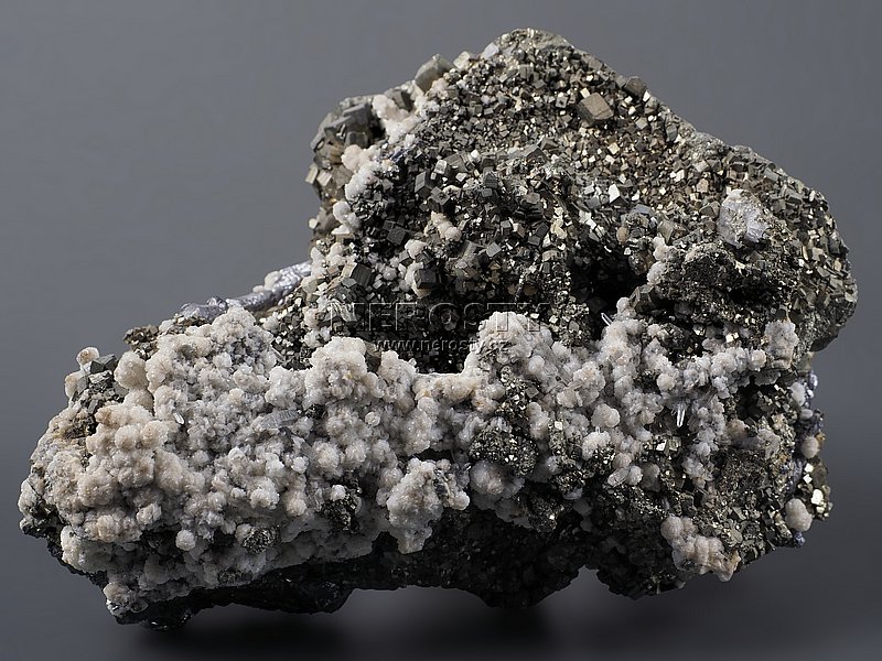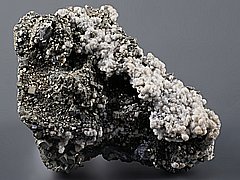 Drobné, lesklé pyritové krychličky porostlé kuličkami manganokalcitu.Podložka, tvořená směsí pyritu a sfaleritu, je porostlá krystalovaným pyritem. Na něj narůstá lehce do béžova zabarvený karbonát, pravděpodobně manganokalcit, možná vzácnější kutnahorit.