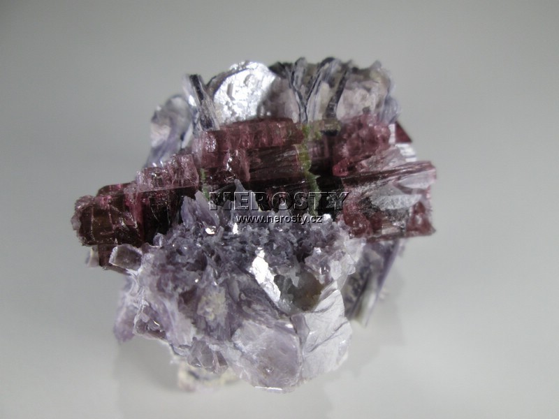 Pěkná ukázka čírých a lesklých růžových krystalů rubelitu na lupenech lepidolitu. Nejdelší krystal rubelitu měří 40 mm. |