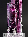 Dlouhý a dobře rostlý multikrystal rubelitu.Multikrystal rubelitu z ruské lokality Malkhan (někdy nesprávně nazývané Malchansk) tvoří tmavě červený, skelně lesklý, průsvitný, podélně rýhovaný, perfektně ukončený krystal dosahující velikosti 13.5 cm.