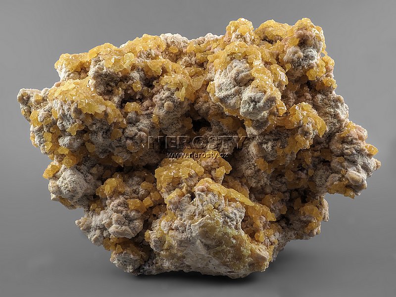 Nádherná ukázka síry z klasické historické lokality na Sicílii.Sytě žluté krystaly síry o velikosti do 30 mm jsou v kombinaci s čirým celestinem, sádrovcem a aragonitem narostlé na kusové síře..