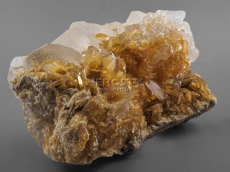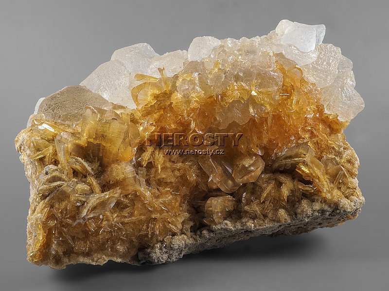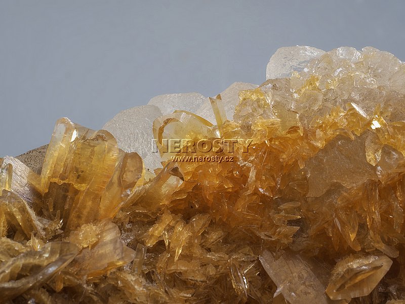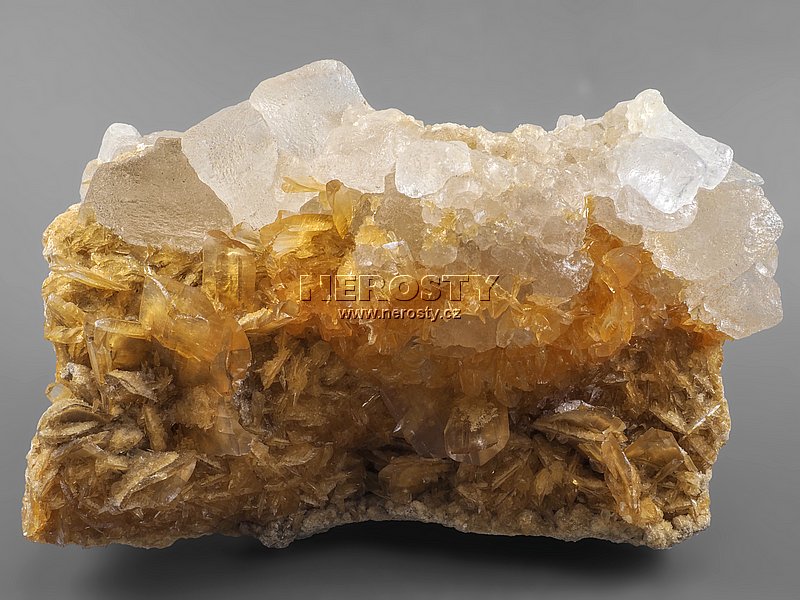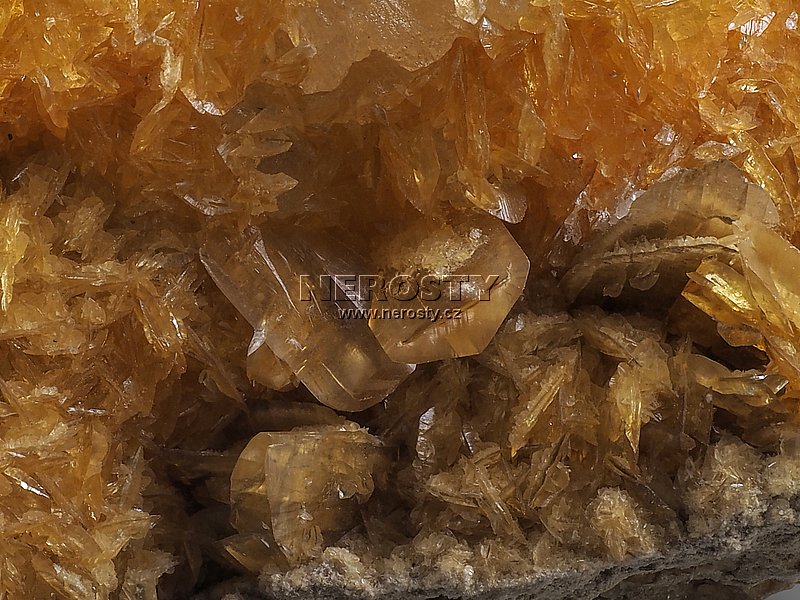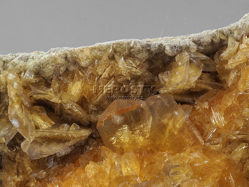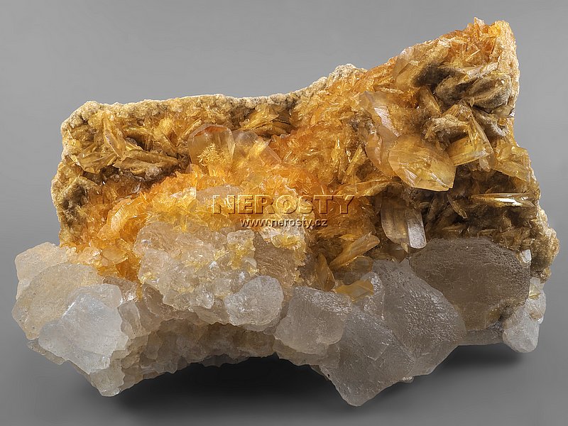 Relativně velký vzorek oranžového peruánského sádrovce v kombinaci s halitemMedově oranžové krystaly sádrovce jsou lemovány velkými krystaly halitu - soli.