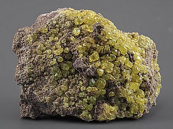 Pěkná ukázka drobných sytě žlutých krystalů síry z Bolívie.Síra vytváří krystaly do velikosti 8 mm a je narostlá na kusové béžové síře. Prasklina v zadní části nepostupuje do hloubky vzorku který je pevný a kompaktní.