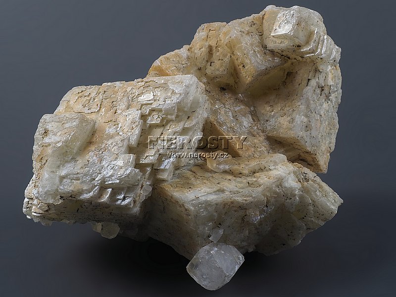 Volná drúza tvořená srostlými krystaly sideritu.Na až 5 cm velkých a lehce okrově zbarvených krystalech sideritu sedí několik krystalů kalcitu. Největší z nich měří zhruba 1 cm.