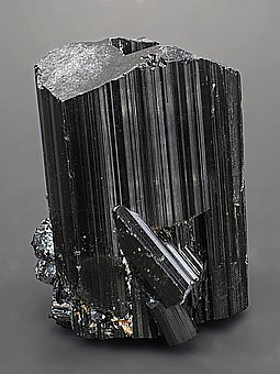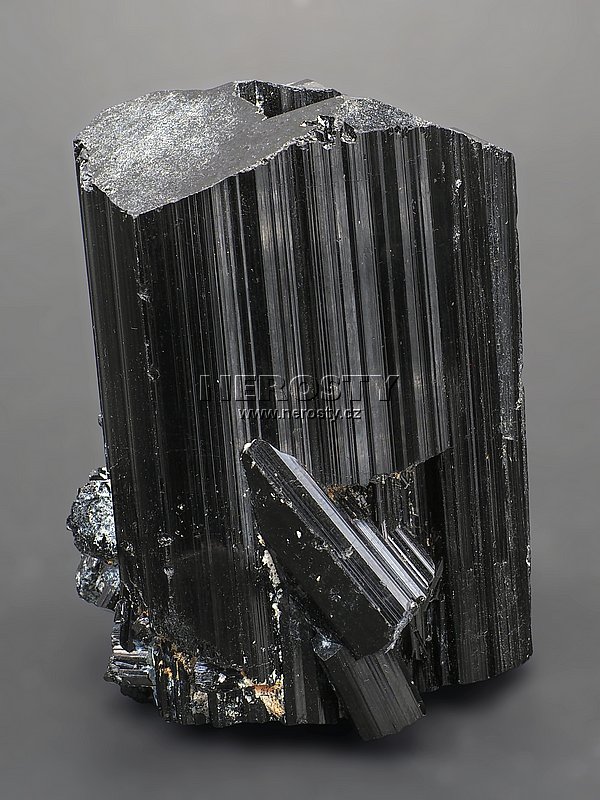 Černý turmalín, velký a lesklý krystal.Volně stojící, z podložky odlomený krystal s výrazným rýhováním, klasickým zakončením s několika okénky