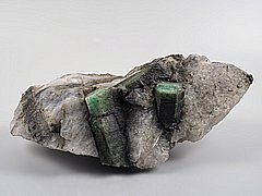 Smaragdové krystaly zarostlé v křemeni.V masivním bílem křemeni lze najít několik krystalů nedrahokamového pastelově zeleného smaragdu. Na pohledové straně vzorku to jsou dva jako prst silné a cca. 4 cm dlouhé neukončené krystaly. Plochy krystalů jsou lehce potaženy zbytky biotitového reakčního lemu.