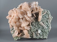 Skupina velkých stilbitových krystalů na prehnitu.Z ploché horninové podložky porostlé drobně krystalovaným nazelenalým prehnitem a tu a tam také čirým apofylitem vyrůstají ploché, sytě růžové a perleťově lesklé různě orientované krystaly stilbitu. Délka krystalů nepřesahuje 50 mm. Samozřejmostí je jejich absolutní nepoškozenost.