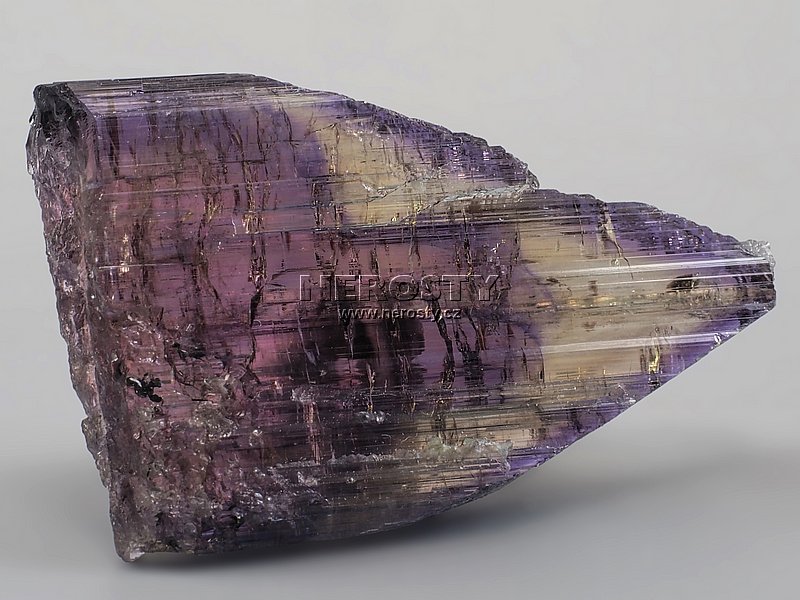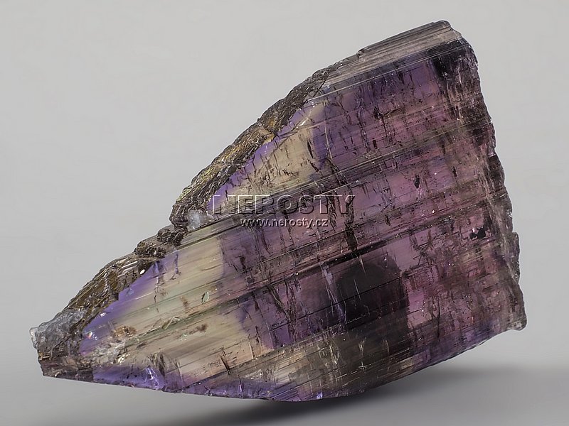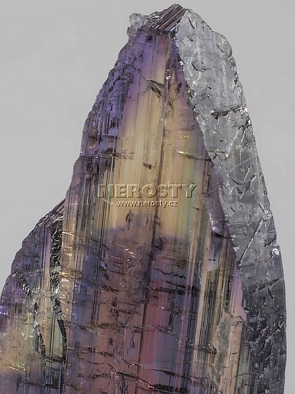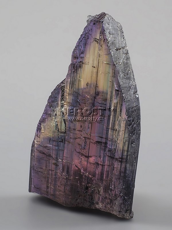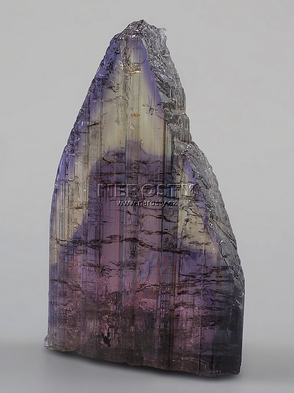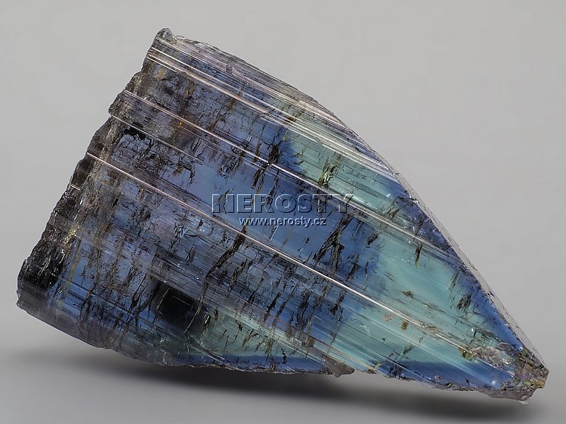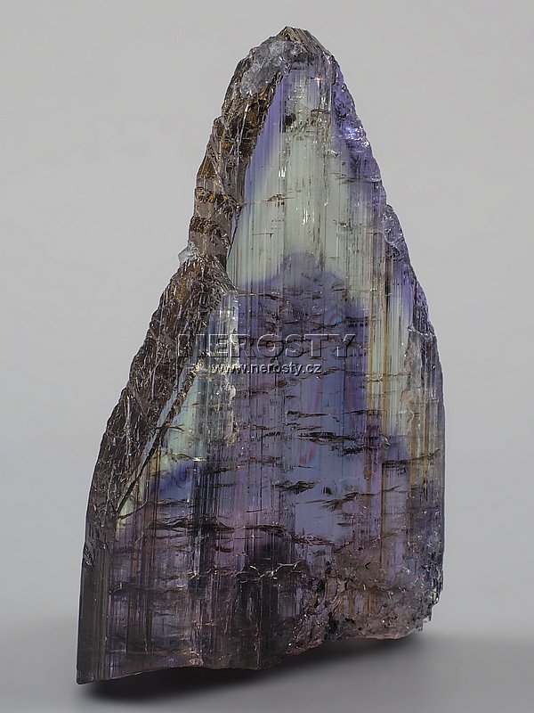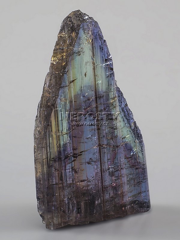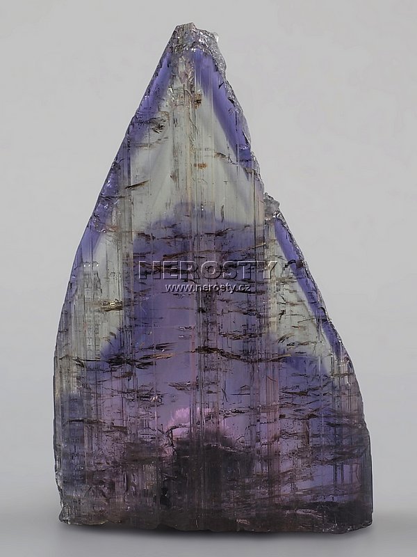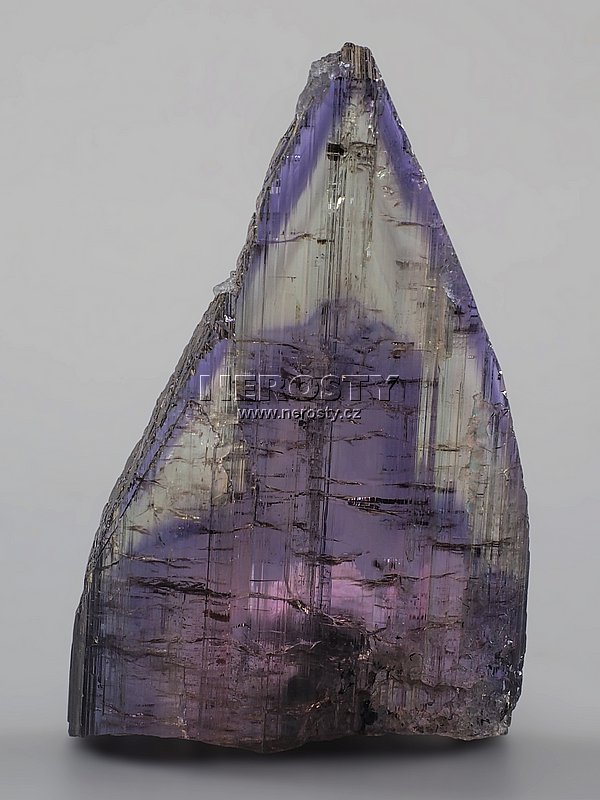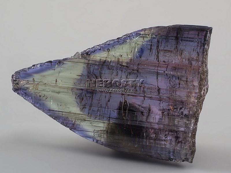 Dvoubarevný, plochý a velmi dobře průsvitný krystal tanzanitu.Uvnitř plamen připomínajícího protáhlého a výrazně podélně rýhovaného krystalu tanzanitu je intenzivněji vybarvená zóna vytvářející neopakovatelný obrazec. Krystal je volně stojící.