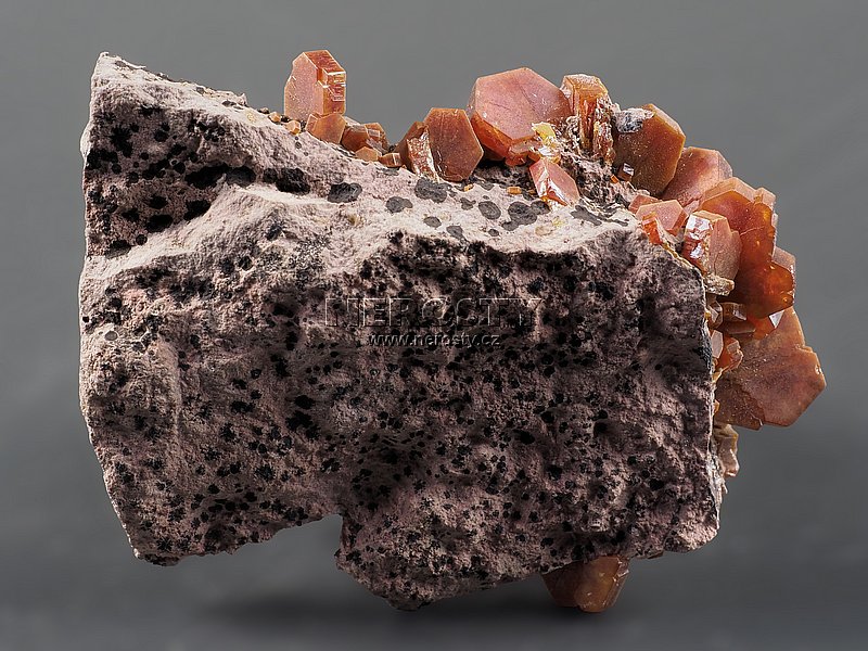 Korunka tvořená srůstem vanadinitových krystalů narostlých na horninové podložce.Na vzorku jsou narostlé ploché, krátce sloupcovité, matně lesklé, oranžově červené a na hranách prosvítající krystaly vanadinitu.