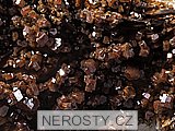 Drůza silně skelně lesklých krystalů vanadinitu na barytu. Velikost krystalů vanadinitu maximálně 5 mm. |