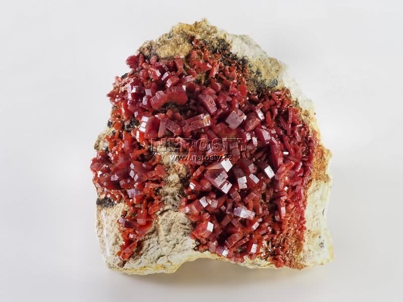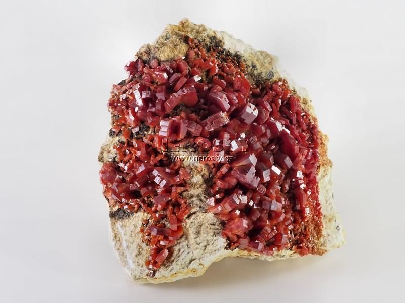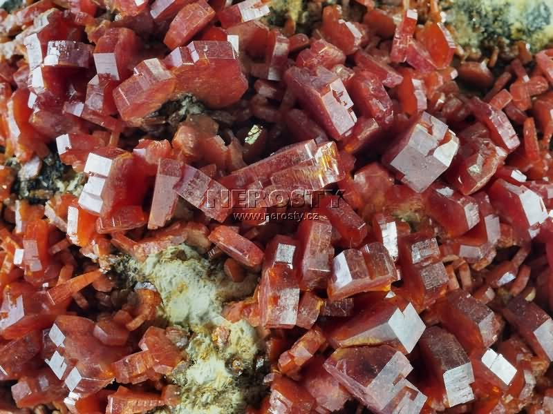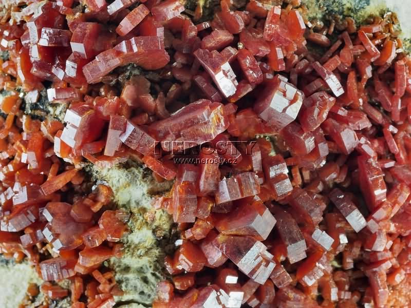 Sytě až krvavě červené, vyhraněné, lesklé krystaly vanadinitu. |