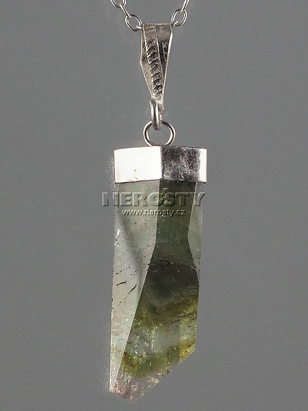 Krystal zonálně zbarveného turmalínu s čepičkou ze stříbrného kovu opatřenou očkem pro řetízek.Tvar krystalu je upraven broušením. Výšku uvádíme bez očka.