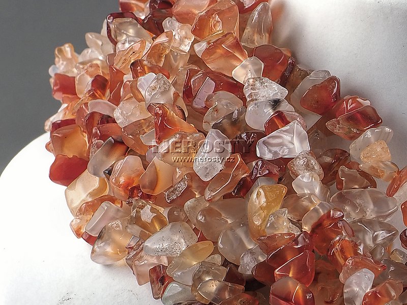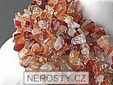 Náhrdelník z drobných nepravidelných valounků nestejnoměrně zbarveného chalcedonu - karneolu.Nestejně velké a nepravidelně tvarované kameny jsou velké cca 5-7 mm. Náhrdelník s obvodem cca 40 cm má klasické kovové zavírání ve stříbrné barvě.