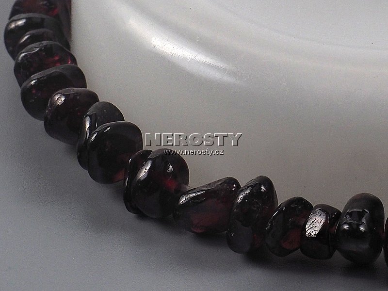 Granátový náramek poskládaný z valounků vínově červenofialového almandinu.Univerzální velikost. Náramek je fotografován na trnu o průměru 65 mm. Vzhledem k tomu, že náramek je navlečený na pružné gumičce, je vhodný téměř pro každou ruku.