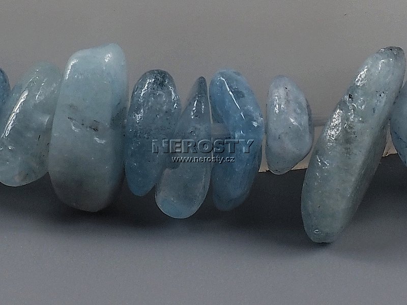 Náramek je poskládaný z valounků blankytně modrého akvamarínu.Průměr kamínků je cca 6-8 mm. Náramek je fotografován na trnu o průměru 65 mm. Vzhledem k tomu, že náramek je navlečený na pružné gumičce, je vhodný téměř pro každou ruku. Jedná se o univerzální velikost