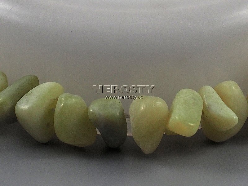 Náramek ze žlutozeleného jadeitu vyrobený z drobných a nestejně velkých tromlovaných kamínků navlečených na gumičce.Univerzální velikost. Náramek je fotografován na trnu o průměru 65 mm.