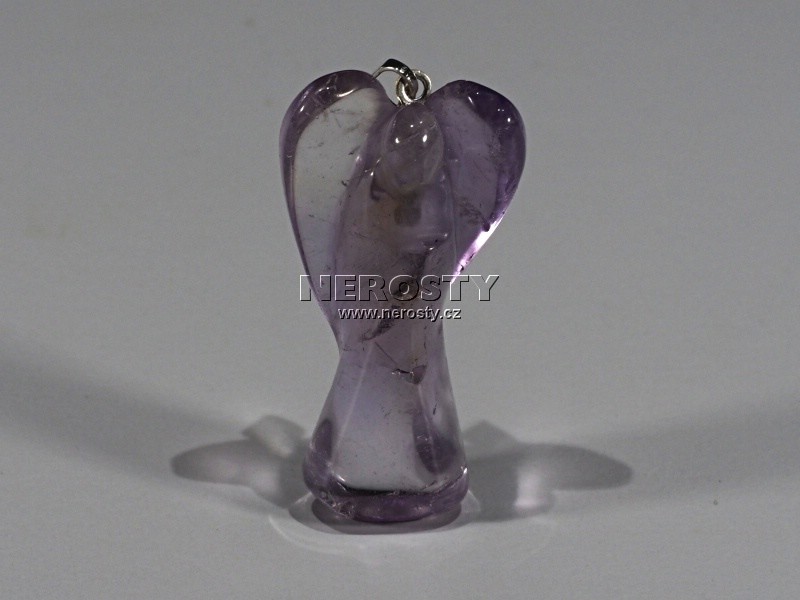 Přívěšek, figurka anděla s očkem pro řetízek. Figurka je vyrobena z vybraného kusu kamene, v tomto případě ametystu. |