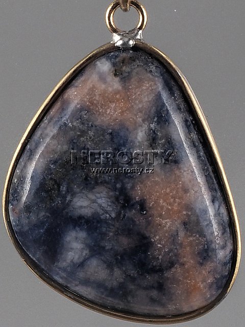 Přívěsek ze světlého lapisu s růžovými skvrnami v kovové obrubě, originální šperk.Kámen je uchycen v rámečku z mosazi a cínu. Osazený kámen nesnese ponoření v galvanizační lázni a z toho důvodu není závěs pozlacen ani postříbřen.