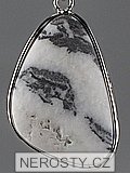 Přívěsek ze šedobílého kalcitu, originální šperk.Kámen s matným leskem a na omak hrubším povrchem je zasazen v obroučce z obecného, galvanicky postříbřeného kovu. Výšku uvádíme bez očka.