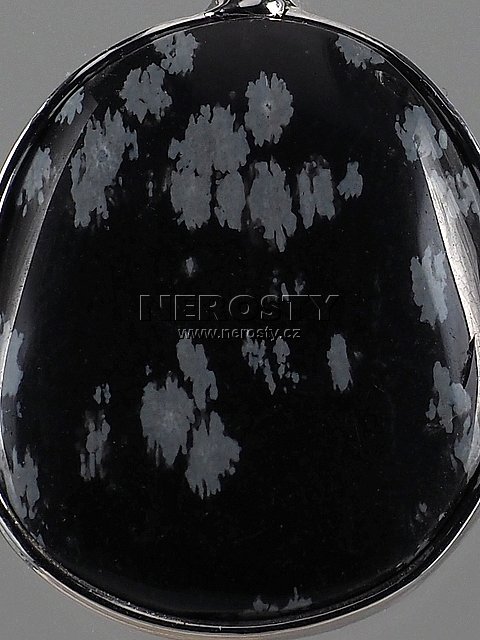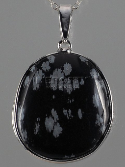 Přívěsek z vločkového obsidiánu, originální šperk.Kámen je zasazen v obroučce z obecného, galvanicky postříbřeného kovu. Výšku uvádíme bez očka.