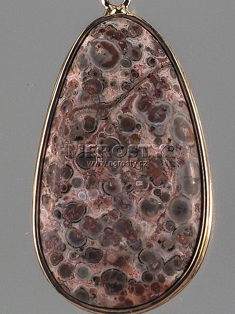 Přívěsek z jaspisu s charakteristickou kresbou (leopard skin), originální šperk.Kámen je zasazen v obroučce z obecného, galvanicky pozlaceného kovu. Výšku uvádíme bez očka.
