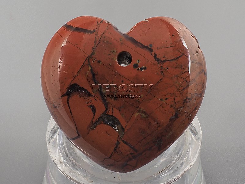 Srdce z červeného jaspisu o otvorem na protažení šňůrky či kůžičky.Fotografováno v misce o průměru 6 cm.